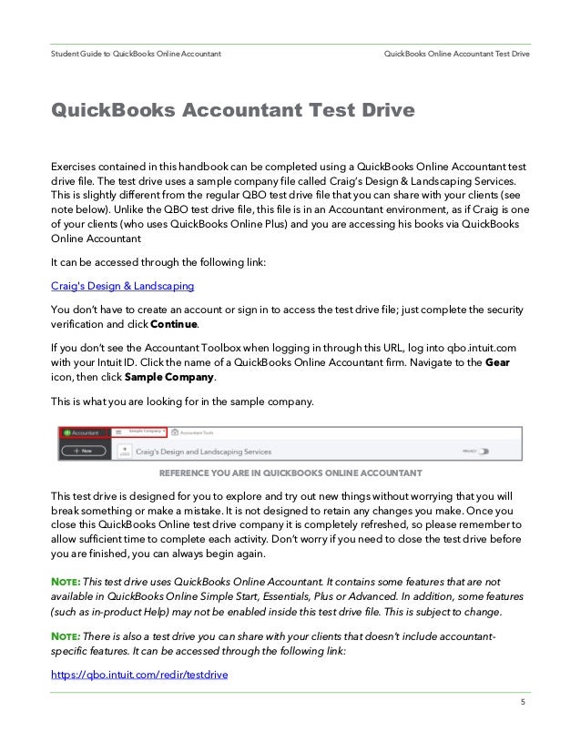 United States QuickBooks Online Advanced. The test drive uses a sample company file called Craigs Design Landscaping Services. If you are on the fence about QuickBooks Online or wanting a safe space to practice new skills then you will want to bookmark the web address for this QBO S.
